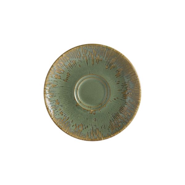 Design: Sage green reactive glaze with gold detailing and coupe style well evoking light refraction and earthy elegance