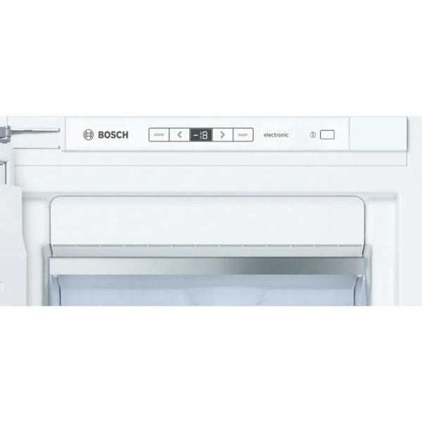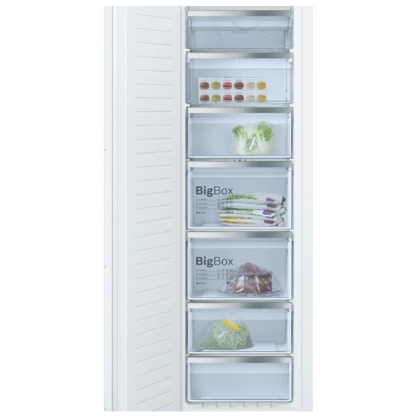 The Bosch Serie 6 GIN81AE30G Built-In Upright Freezer is designed to keep your frozen goods organized, fresh, and easily accessible. With NoFrost technology, you’ll never have to worry about manual defrosting, while VarioZone adjustable shelves provide maximum flexibility to store items of all shapes and sizes. The BigBox drawer allows for stacking storage containers or keeping larger frozen items effortlessly.