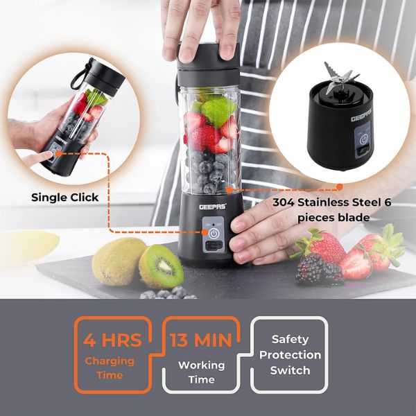 Power up your nutrition on the go with the Geepas Rechargeable Portable Blender in Black. Designed for fast, one-touch operation, this sleek mini blender is perfect for shakes, smoothies, and health drinks wherever your day takes you.