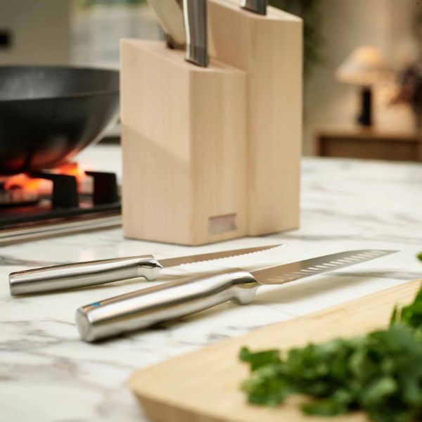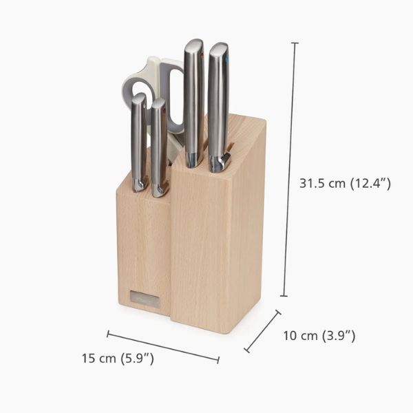 Upgrade your kitchen essentials with the JosephJoseph Elevate Fusion 5-Piece Knife & Scissor Set with Beechwood Block. Designed for performance and hygiene, this premium set features Elevate™ technology with weighted handles and integrated tool rests that keep blades raised off surfaces to reduce mess and improve cleanliness. Crafted with durable Japanese stainless-steel blades, the knives, cleaver, and multifunction scissors deliver precise cutting performance for everyday food preparation. The stylish beechwood block with non-slip feet keeps everything neatly organised and easily accessible on your countertop.