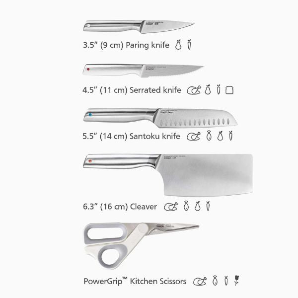 Complete 5-Piece Set: Includes 3.5" (9 cm) paring knife, 4.5" (11 cm) serrated knife, 5.5" (14 cm) Santoku knife, 6.3" (16 cm) cleaver, and PowerGrip kitchen scissors.