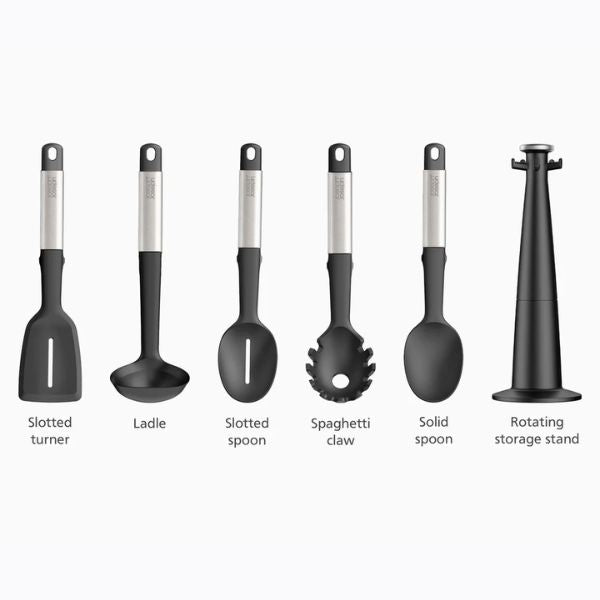 The silicone utensil heads are heat-resistant up to 210˚C/410˚F, making them safe for use with non-stick cookware. The set comes with a rotating storage stand, allowing you to easily select and store your tools.