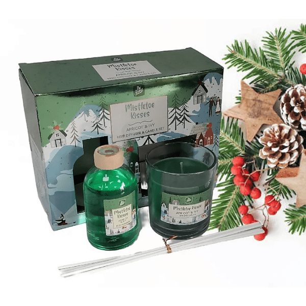 All-in-One Set: This gift set includes a Christmas Jar Candle and a 100ml Reed Diffuser bottle, complete with reeds, allowing you to enjoy the Mistletoe Kisses (Apricot & Ivy) fragrance from different sources.
