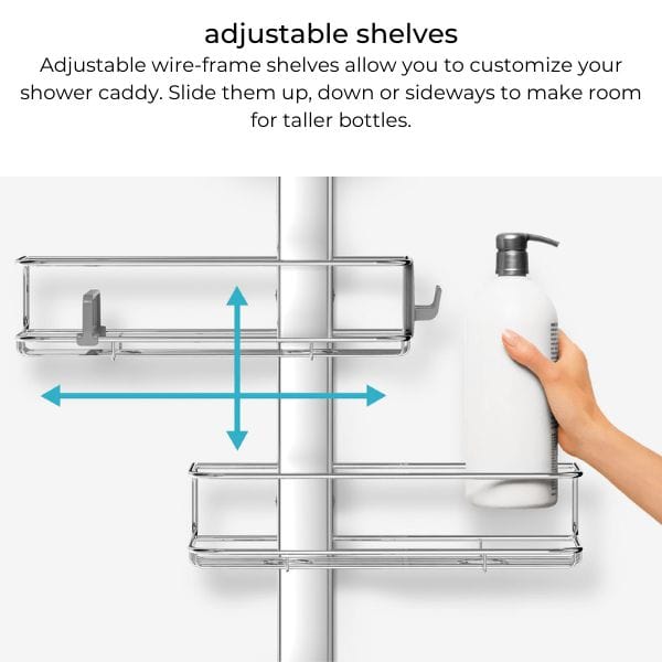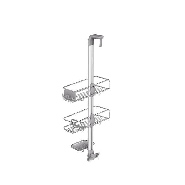 Organize shower clutter with our over-door shower caddy. Installation is easy — just hook the adjustable hanger over the shower door and it automatically tightens for a secure grip. It has fully adjustable shelves that are easy to reposition with quick-adjust dials. An innovative divider and accessory hooks are designed to hold bulky modern tools like facial cleansing brushes and oversized razors. The quick-dry soap dish drains water completely so soap stays dry and lasts longer. Constructed from stainless steel and anodized aluminium so it is rust-proof and easy to clean.