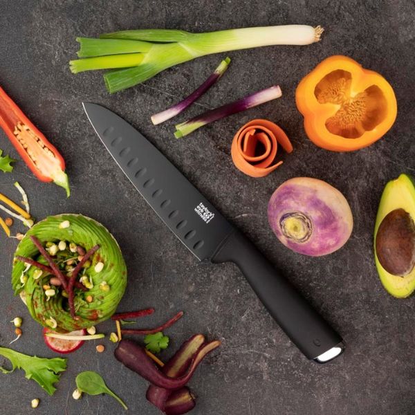 Santoku Knife: A Japanese-inspired design with a Granton blade to reduce sticking and enhance slicing efficiency.