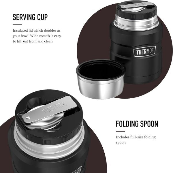 • Thermos Vacuum Insulation: Keeps food hot for up to 9 hours or cold for up to 14 hours.